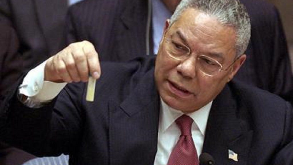 Let’s not forget, Powell is not just some Joe Schmoe; he sits at the heights of US military royalty. Powell served as national security advisor for Ronald Reagan, chairman of the joint chiefs of staff (the highest-ranking US military position) for George H. W. Bush, and secretary of state for George W. Bush.