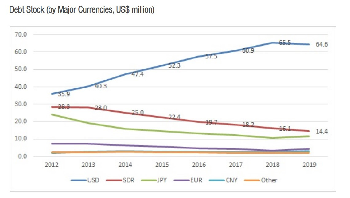 As of the end of 2019, less than 5% of Sri Lanka's foreign debt was denominated in China's currency the yuan (CNY). On the other hand, nearly two-thirds, 64.6%, was owed in US dollars, along with an additional 14.4% in IMF special drawing rights (SDR) and more than 10% in the Japanese yen (JPY).