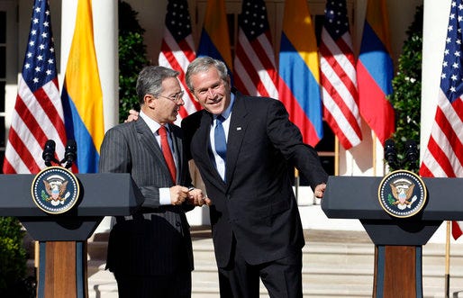 Uribe served as president of Colombia from 2002 to 2010. During this time, the US-backed Colombian military murdered more than 6,400 innocent civilians and dressed them up in the uniforms of revolutionary socialist groups, falsely claiming they had been guerrillas, in what was known as the infamous “false positives” scandal.