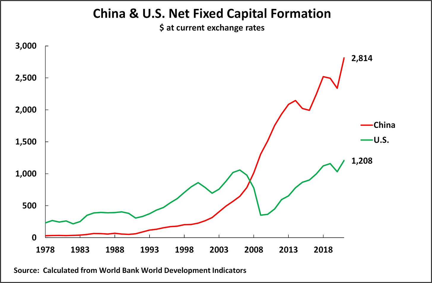 The absolute dollar levels of net fixed capital formation in the U.S. and China