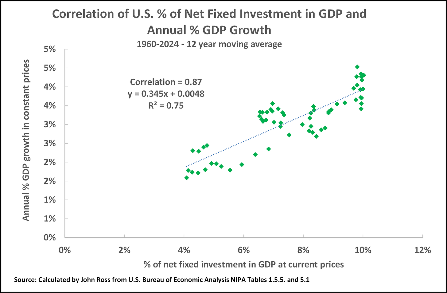 Turning to shorter term movements, as shown in Figure 11, the correlation between the annual percentage of net fixed investment in GDP and the annual average U.S. GDP % growth rate, taking a six-year average GDP growth rate, is 0.78 – six years is taken in this graph as the period for the moving average to correspond to the same length of time, 2019 to 2025, which has elapsed since the peak of the previous U.S. business cycle. As would be anticipated from previous factual data, if a longer period is taken, the correlation is even higher - the correlation for a 10-year period is 0.81 and for a 20-year period it is 0.82.