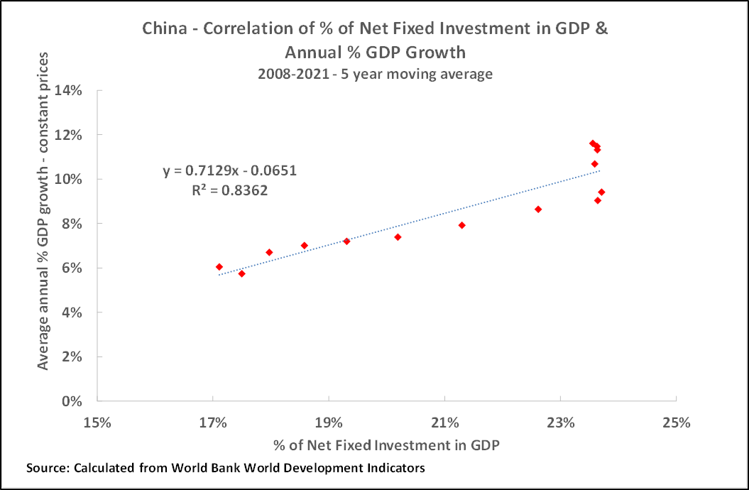 Thus far, specifically, the growth pattern of the U.S. has been analysed. However, it should be clearly understood that this very high correlation of the percentage of net fixed capital formation in GDP and GDP growth in the U.S. is not exceptional, but is in line with all other major economies, including China.
