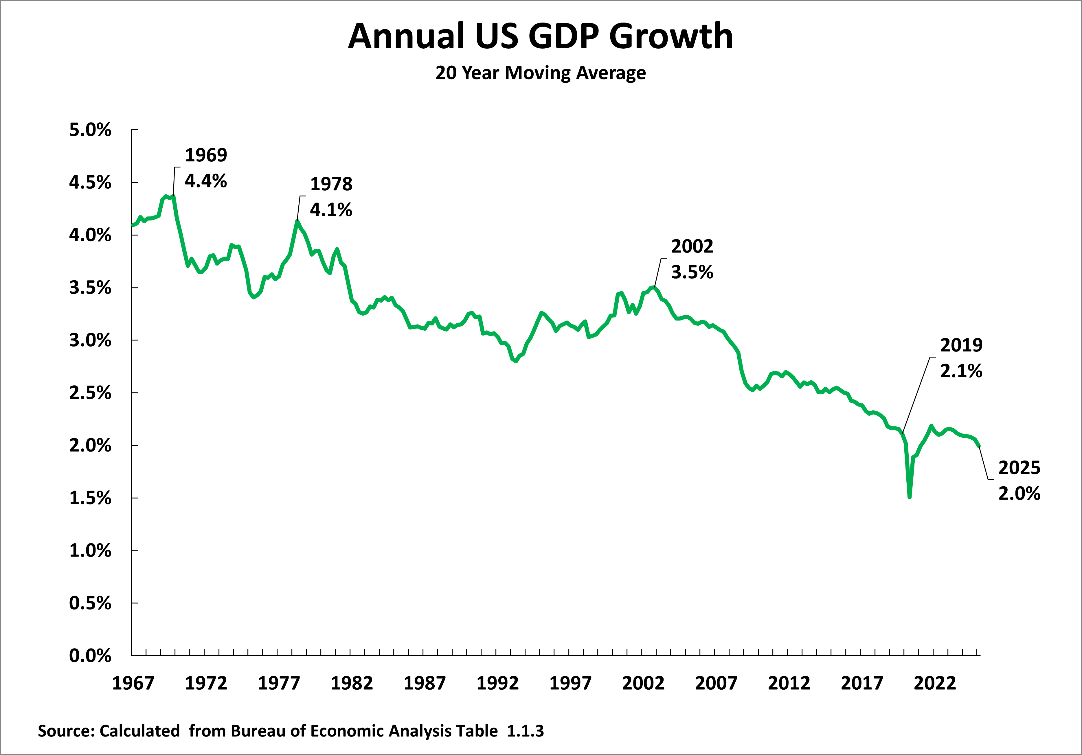 In short, all that occurred in these U.S. fluctuations since Covid was a short-term business cycle movement around the very slowly declining long-term growth rate that has been going on for six decades. There were no fluctuations outside the normal range for the U.S. business cycles.