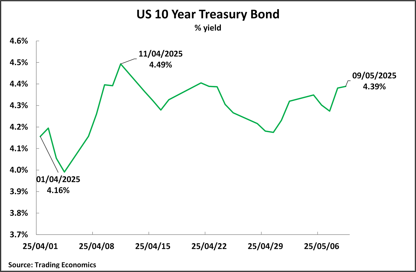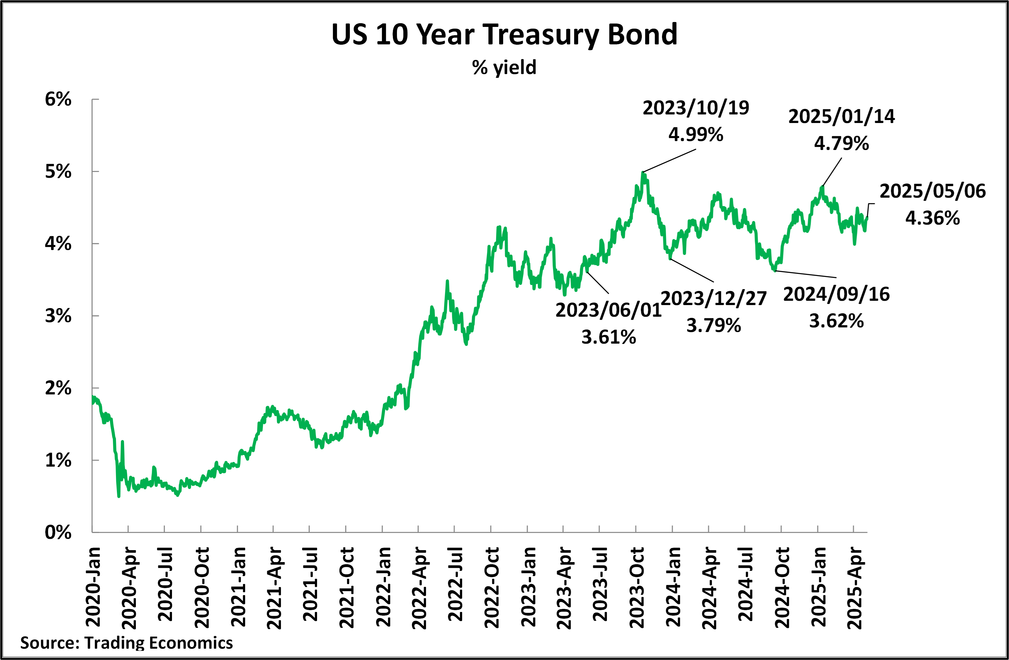 Turning in more detail to the period from April 1, that is, the day before Trump’s “reciprocal tariff” announcements on April 2, Figure 3 shows that nothing has occurred, which takes Treasury bond prices outside the previous trading range. On April 1, the yield was 4.16%, which rose sharply to 4.49% by April 11, but then fell; by May 6, it was only 4.36%, comfortably within the last two years, with a trading range of 3.6%-5.0%. On May 9, the last trading day before the announcement of the 90-day–US China trade agreement, the yield was 4.39%. On the last trading day at the time of writing, 23 May, the yield was 4.50% - entirely within the range in which the 10-year Treasury has been trading for the last two years.