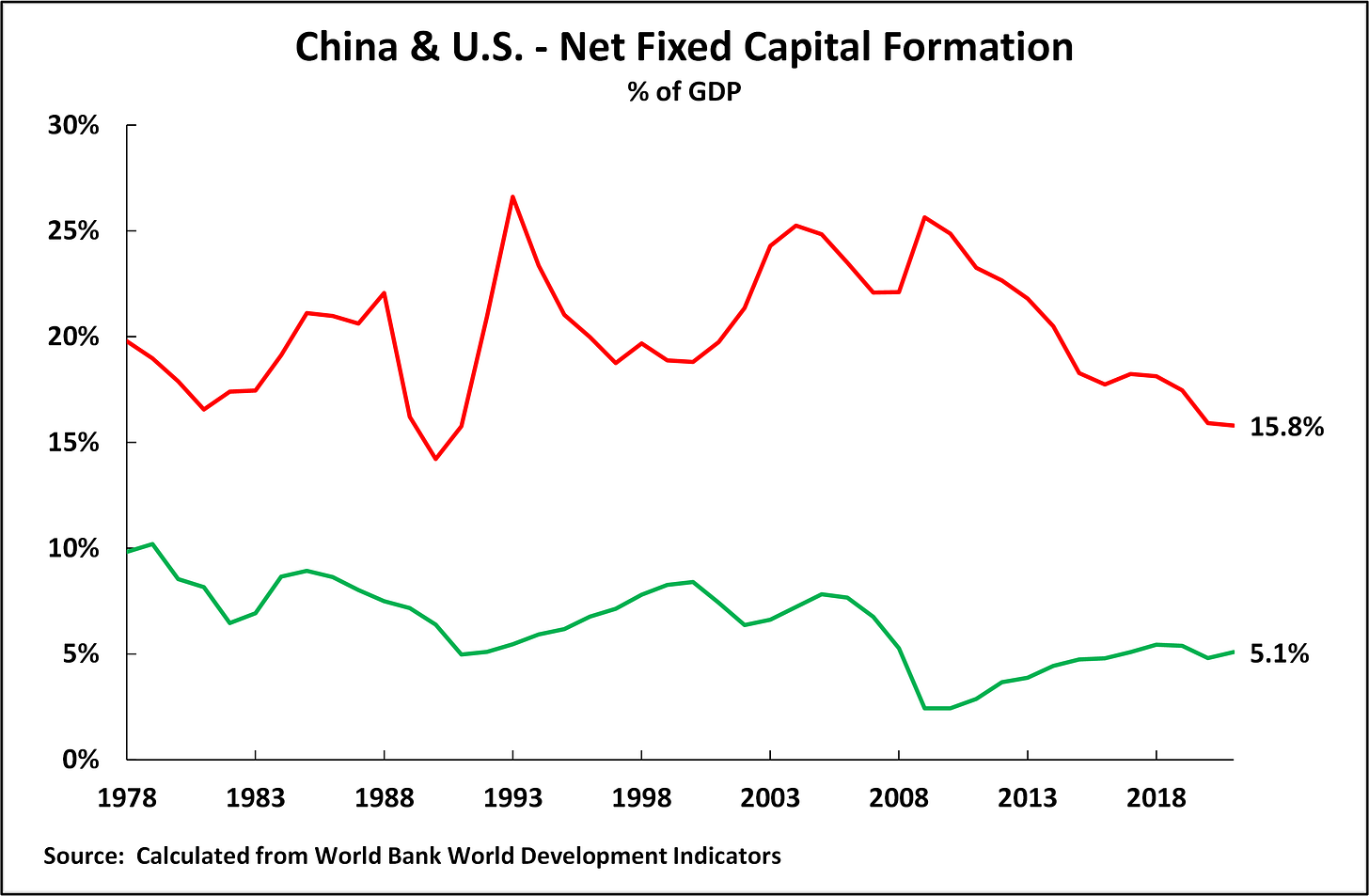 That is, the long-term growth rates of both China and the U.S., as with all very large economies, are closely and positively correlated with the percentage of net fixed capital formation in GDP. It is unnecessary for the present purposes to determine the direction of causality in this – whether the percentage of net fixed capital formation in GDP determines the GDP growth rate, the GDP growth rate determines the percentage of net fixed capital formation in GDP, or some other factor(s) determine both. However, this means that China’s GDP growth rate cannot be accelerated without increasing the percentage of net fixed capital formation in GDP, and that any reduction in the percentage of net fixed capital formation in GDP will lower the economic growth rate.