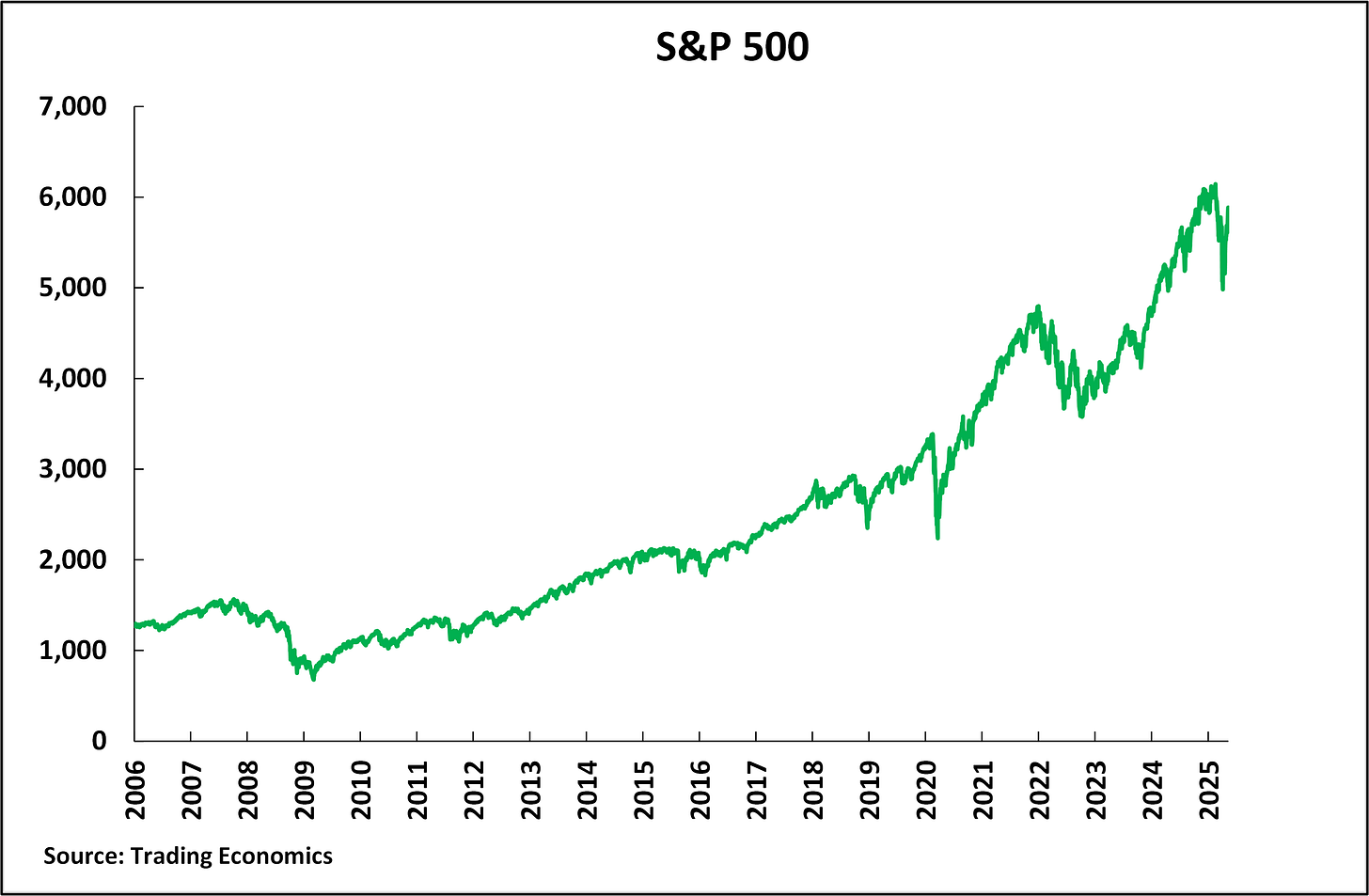 Turning to U.S. share prices, Figure 4 shows the data for the S&P 500 from prior to the international financial crisis to the latest data, that is, from 2006 to May 2025. It may be seen that in this almost 20-year period there were four major episodes of falling prices. Prior to the fall, which has been taking place in 2025, these three were the following: