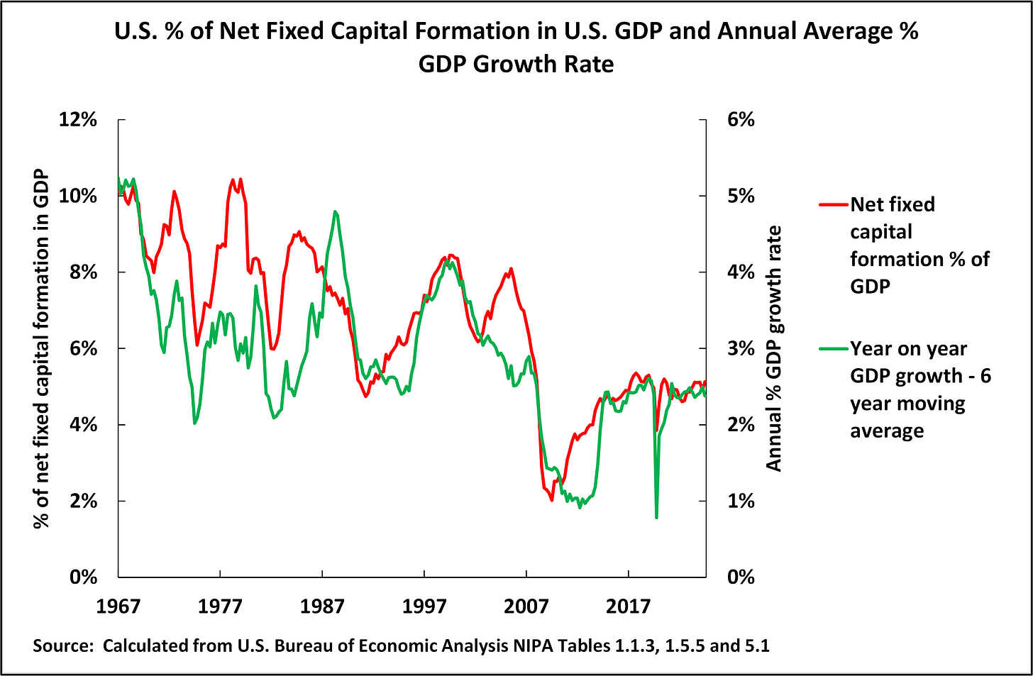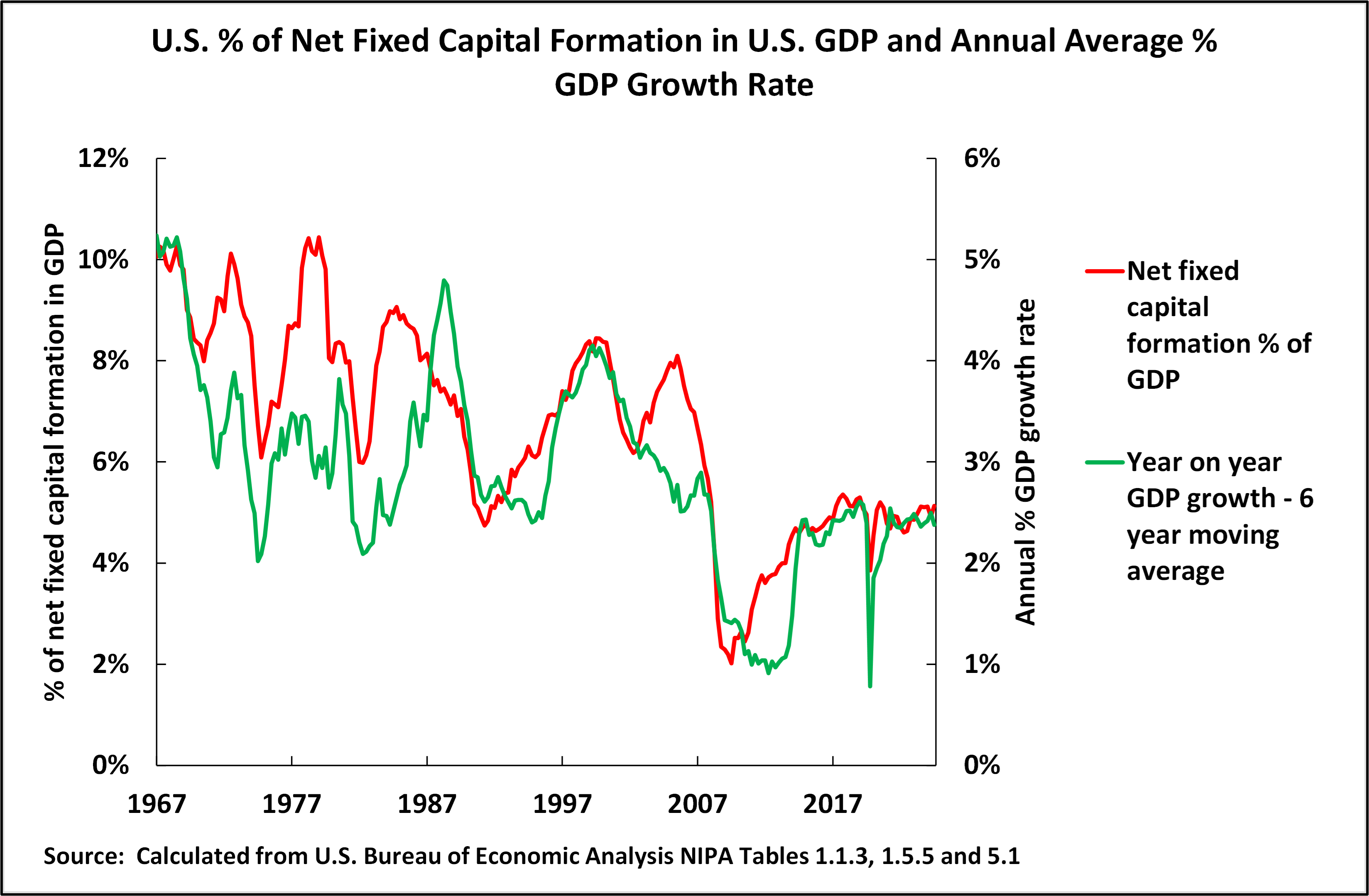 The longer term relation of the percentage of net fixed capital formation in U.S. GDP and the U.S. GDP growth rate