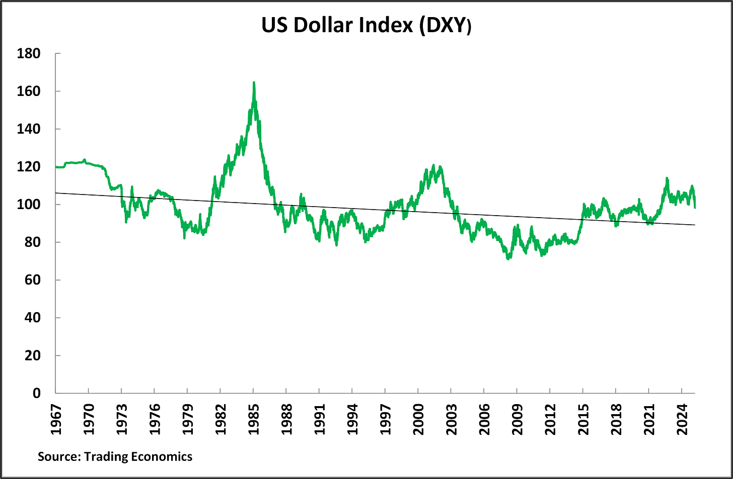 In the three years since then, the dollar has been trading up and down in a range between 114 and 100. Most significantly, for present purposes, during the period from the end of April 2022 to April 1, 2025, its trade-weighted exchange rate did not fall below 99.8.
