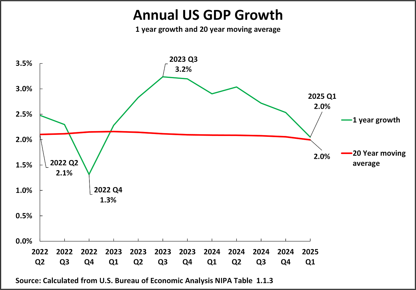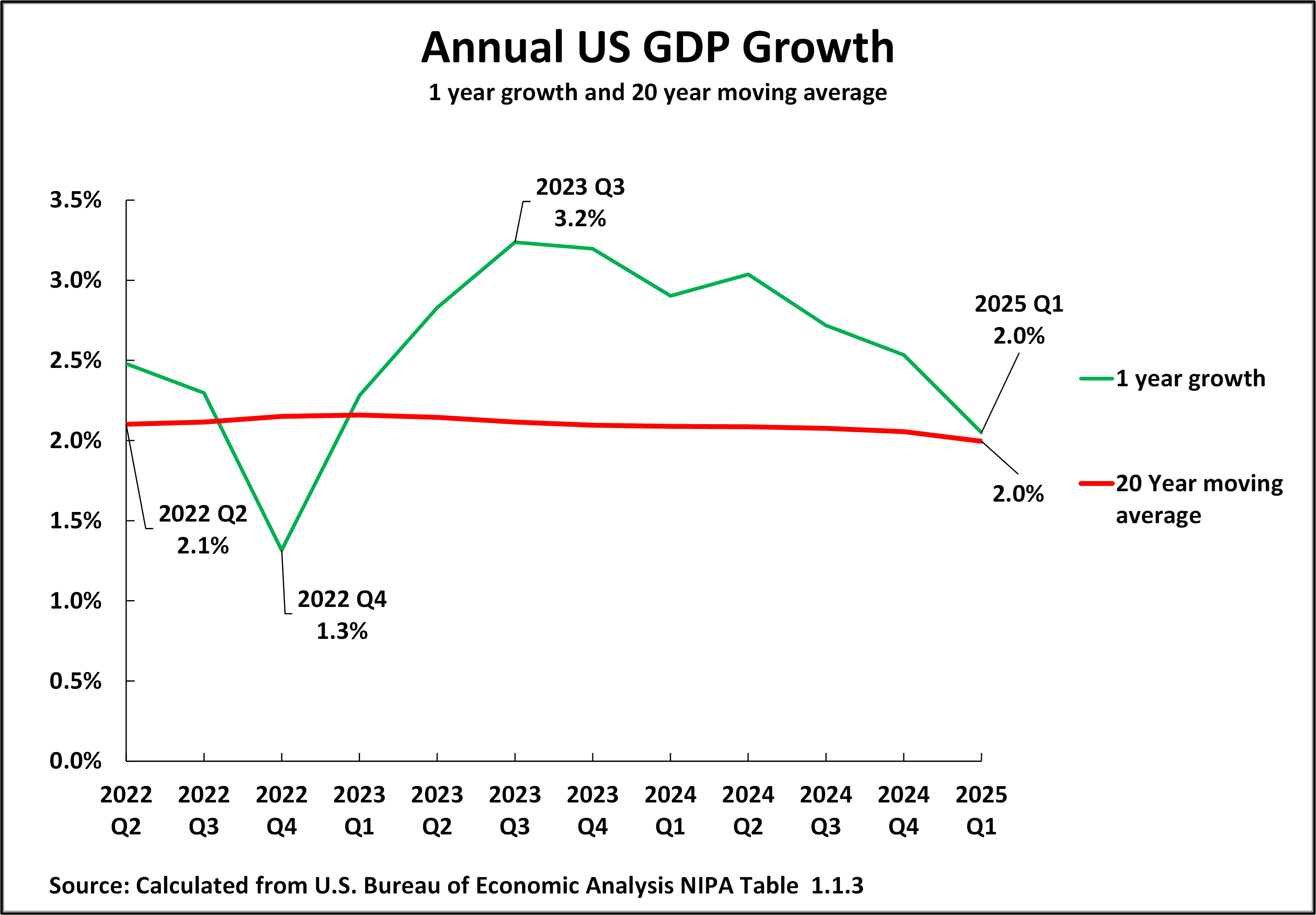 Taking U.S. GDP data, Figure 8 shows that the overwhelmingly strong trend in U.S. economic growth is a gradual slowdown that has been continuing for almost six decades. The annual average U.S. GDP growth rate, taking a long-term moving average to remove the effect of short-term business cycle fluctuations, has more than halved in that period, declining from 4.4% in 1969 to 3.5% by 2002 and 2.0% by the latest data for the first quarter of 2025.