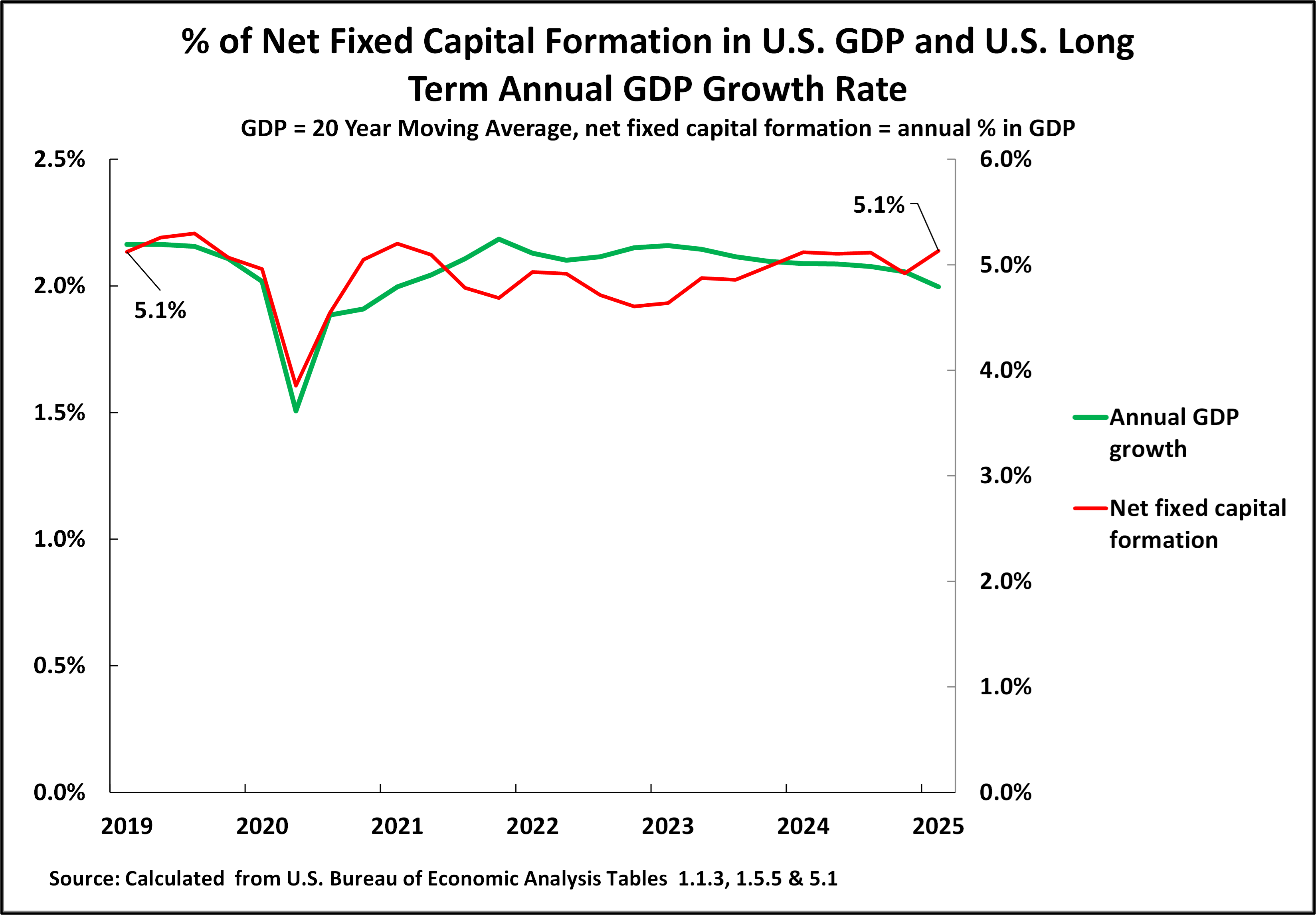 Bearing in mind this relation, Figure 12 then shows that since the peak of the last U.S. business cycle in 2019 to the latest data for the first quarter of 2025 there has been no decline in the percentage of net fixed capital formation in U.S. GDP – it was 5.1% of U.S. GDP at both the beginning and the end of the period. Therefore, there has been no change in the factor that is most closely correlated with GDP growth in the United States. There is, therefore, no factual trend that would indicate that there should be a downturn in the present long-term average growth rate of U.S. GDP - which, as already seen, is slightly above two percent a year.
