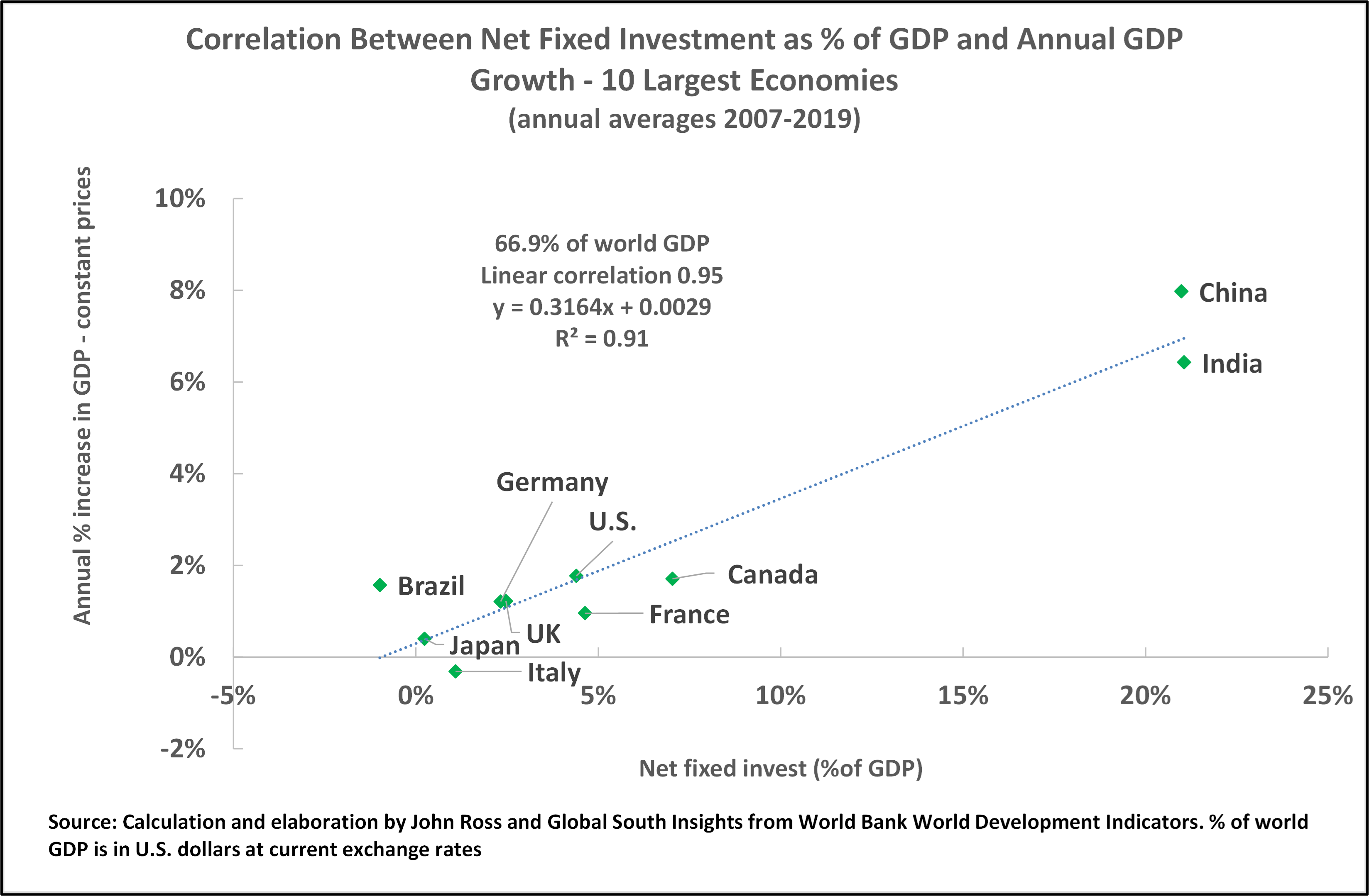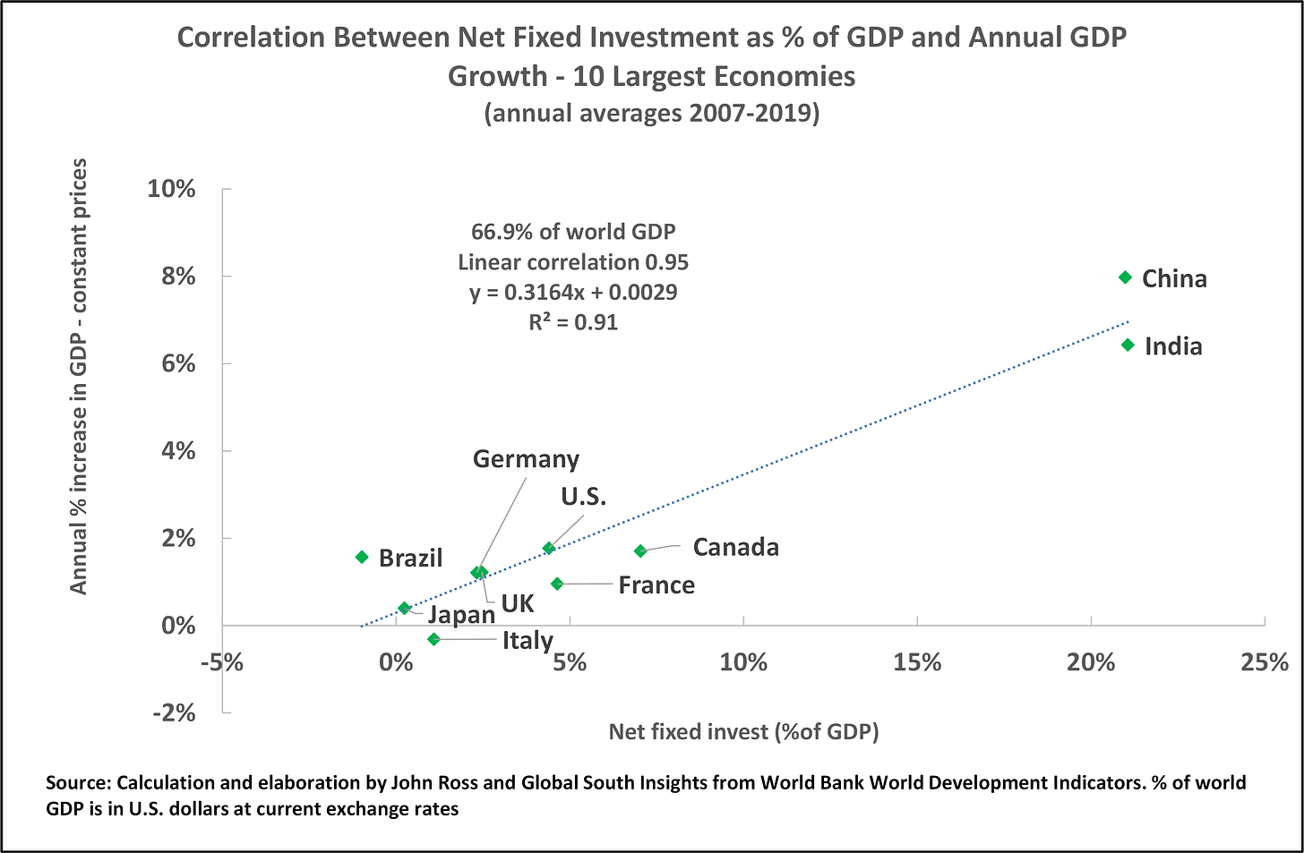 Therefore, in terms of long-term growth, there is no possibility that such large economies have a high rate of GDP growth without a high percentage of net fixed investment in GDP. Any decrease in the percentage of net fixed investment in GDP will be accompanied by a decline in the rate of GDP growth, and any acceleration of GDP growth requires an increase in the percentage of net fixed capital formation in GDP.