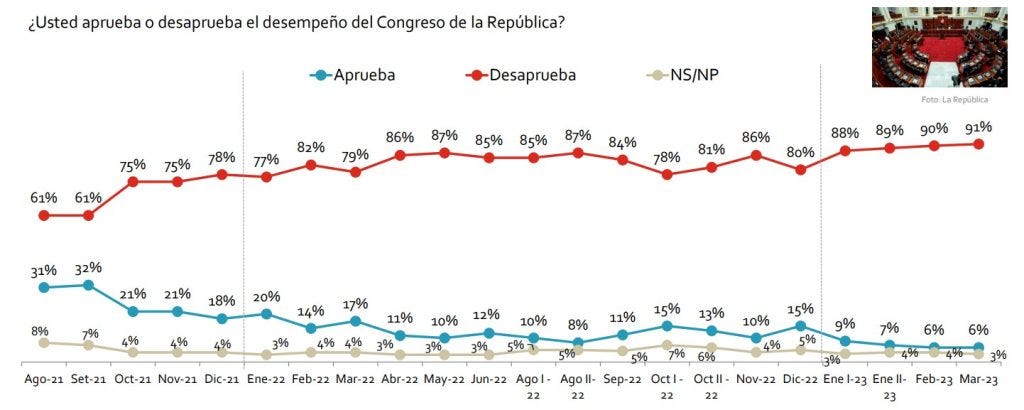 In January, February, and March, Peru's congress had 89%, 90%, and 91% disapproval ratings, respectively.