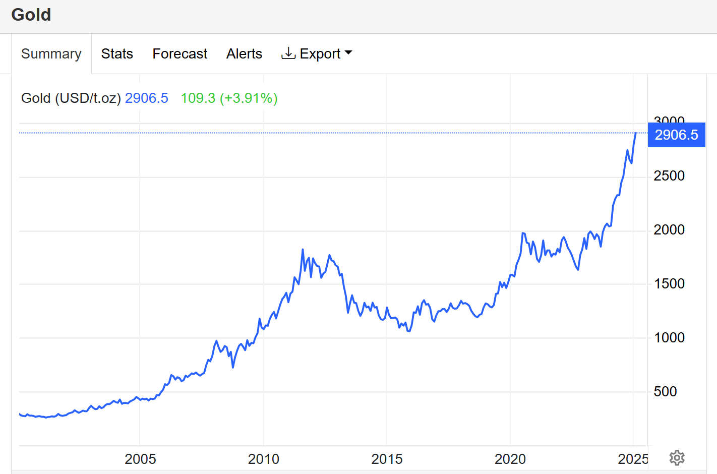However, then something very strange happened. In October 2023, the gold price reached a low of around $1,850, and since then, consumer price inflation has continued to fall. But that relationship broke, and instead the gold price skyrocketed by another thousand dollars to around $2,900.