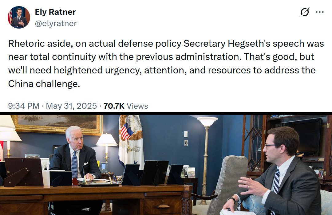 Ely Ratner, who served as the assistant secretary of defense for Indo-Pacific security affairs in Biden's Pentagon, wrote approvingly on Twitter/X, "Rhetoric aside, on actual defense policy Secretary Hegseth's speech was near total continuity with the previous administration”.
