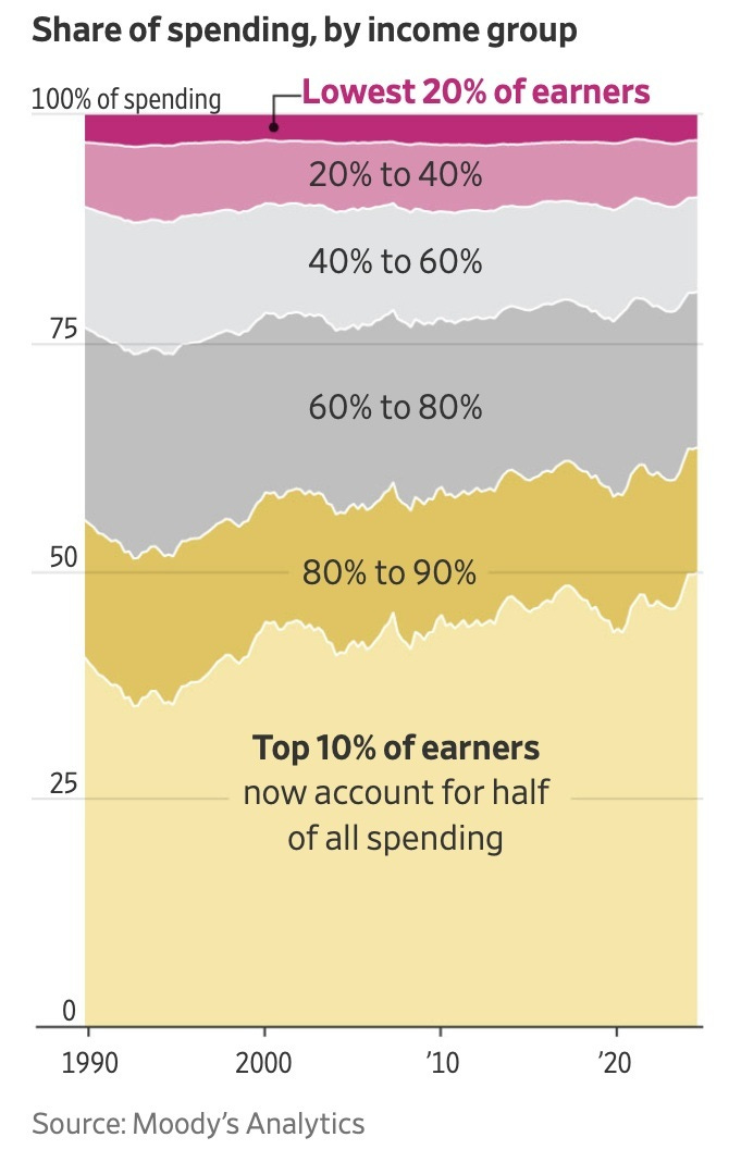 You may have seen this chart going around that shows that now the richest 10% of Americans make up half of the spending in the economy. And of course, the US economy is deindustrialized, and driven largely by consumption.