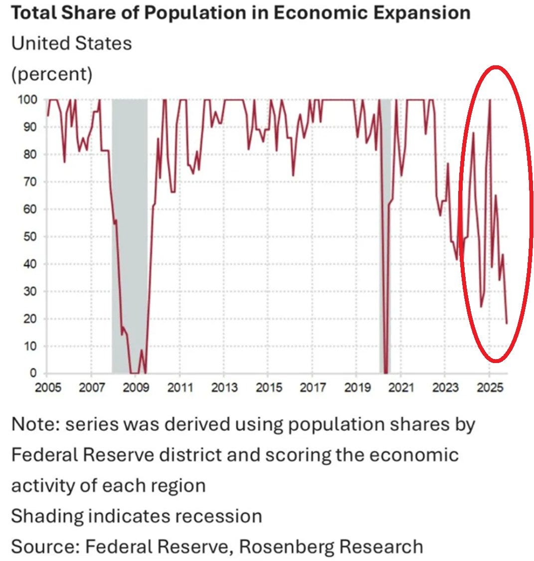 You can see that, as of the end of 2025, only about 20% of the US population is living in a local economy that actually is growing.