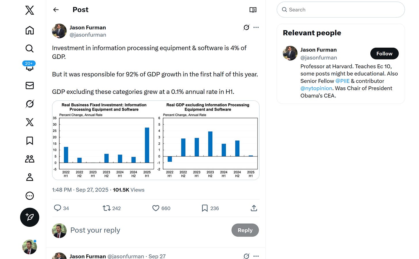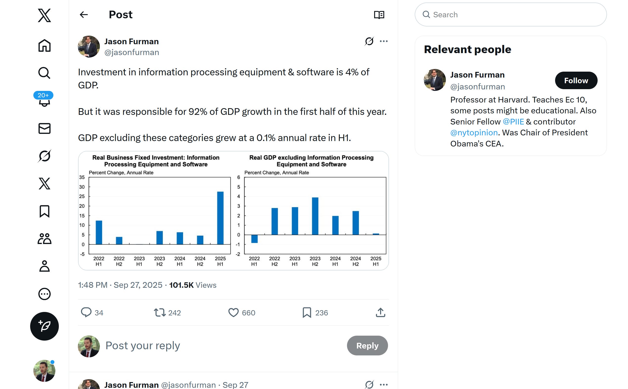 This economist at Harvard, [Jason Furman], found that, in the first half of 2025, 92% of GDP growth came from investment in information processing equipment and software, which is largely AI.