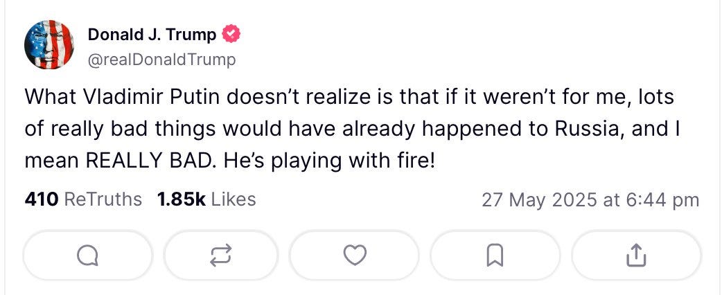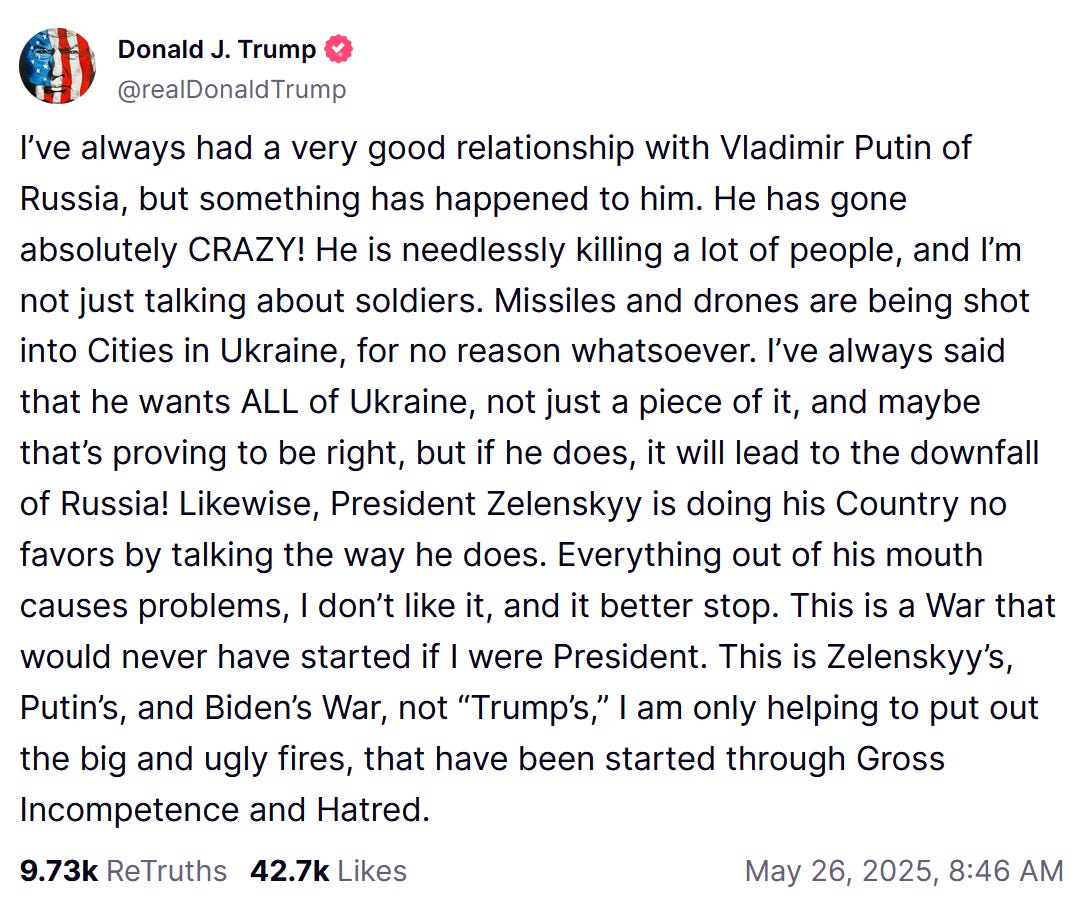And what's more, I think that if Trump is now acting so—saying such negative things about Russia—it’s not clear to me that he will try to make peace. And if he doesn’t try to make peace, then will he just nonchalantly—without caring about it—continue the war?