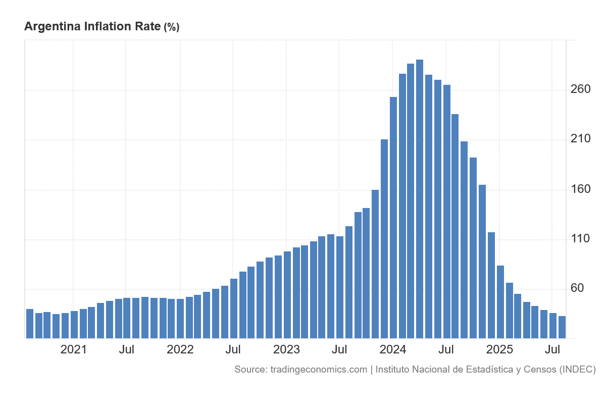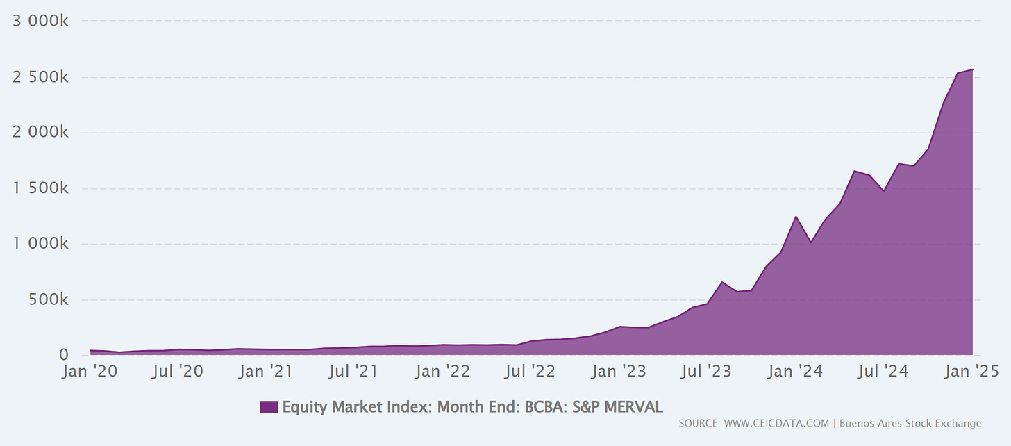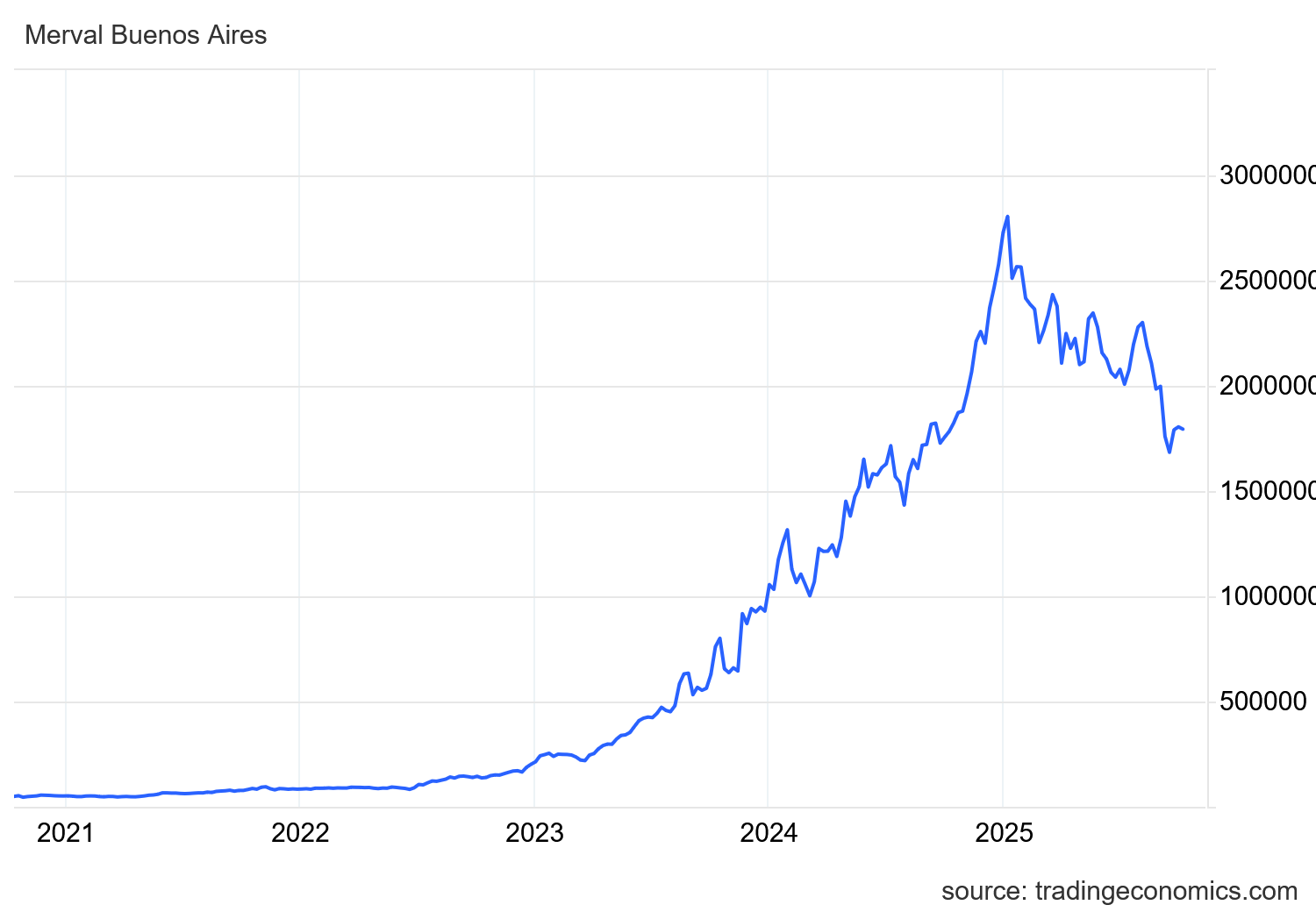 Moreover, the bond market has been in crisis, with foreign investors selling off Argentine government debt. Milei’s victory in the 2023 election had also led to the inflation of a massive bubble in the Argentine stock market, and that has burst as well. It has been in free fall for all of 2025.