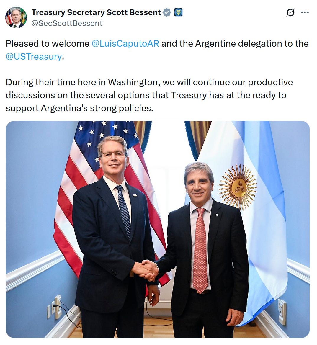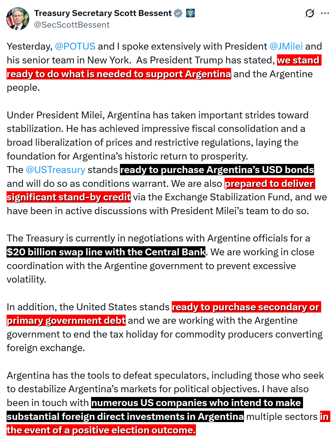 Moreover, Bessent said the Treasury is willing to directly purchase Argentine bonds. This means that the US government will be lending money to the Milei administration, by directly purchasing Argentine government debt. By doing so, Washington can help Buenos Aires reduce its borrowing costs.