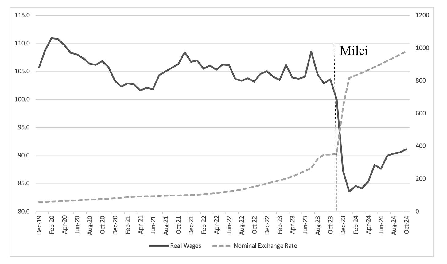 Real wages plummeted immediately after Milei won the October 2023 election. This was because Milei had promised to abandon Argentina’s currency, the peso, and to instead adopt the US dollar. Milei then devalued the peso, crushing the purchasing power of average Argentine workers, and causing inflation to rise much faster than wages. Real wages have slightly risen since then, but they are still only a fraction of what they were before Milei won.