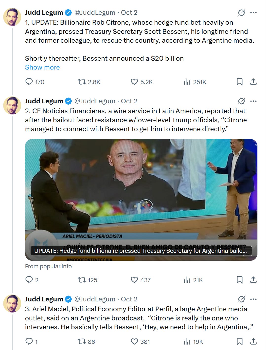 Meanwhile, journalist Judd Legum pointed out that one of the biggest benefactors of the Trump administration’s bailout is an American hedge fund billionaire named Robert “Rob” Citrone who has bet big on the Argentine economy. He also just so happens to be friends with Scott Bessent.