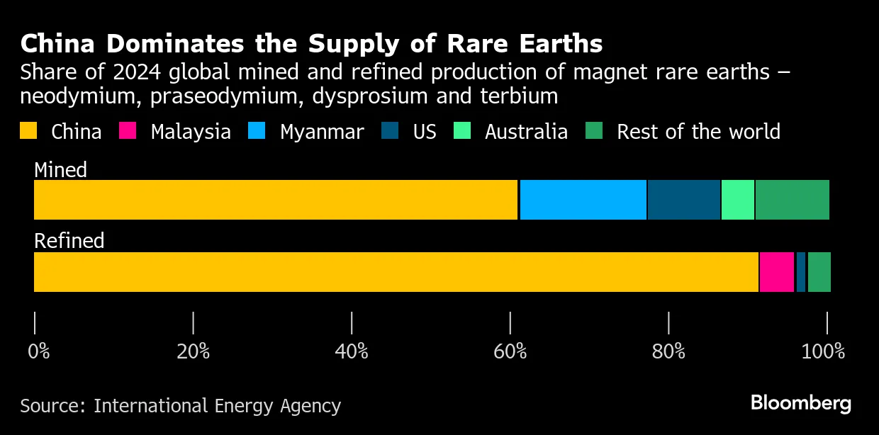 China made up more than 60% of the mining and around 90% of the refining of rare earths, as of 2024.