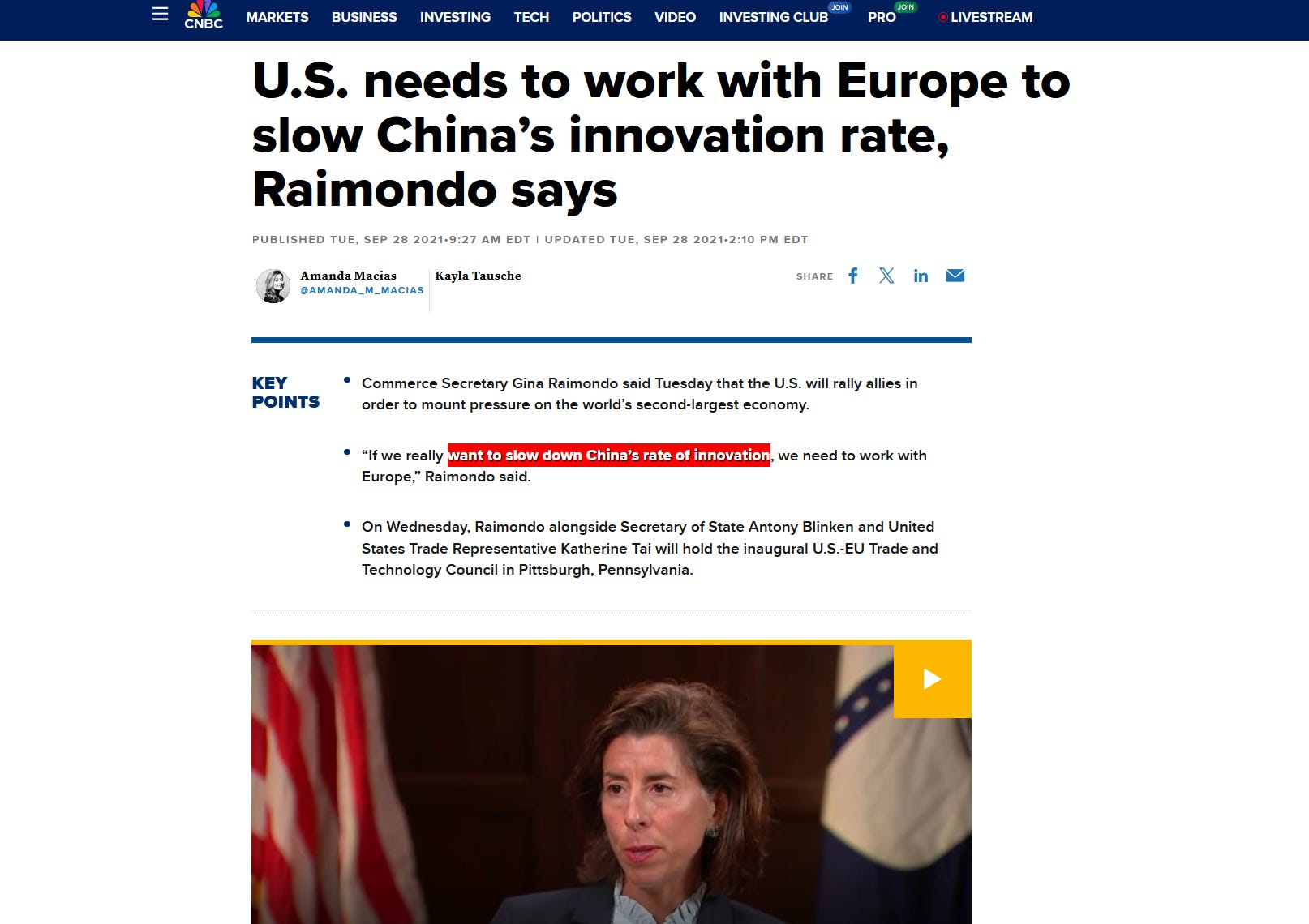 Commerce Secretary Gina Raimondo even admitted that the US government’s goal was to “slow down China’s rate of innovation”.
