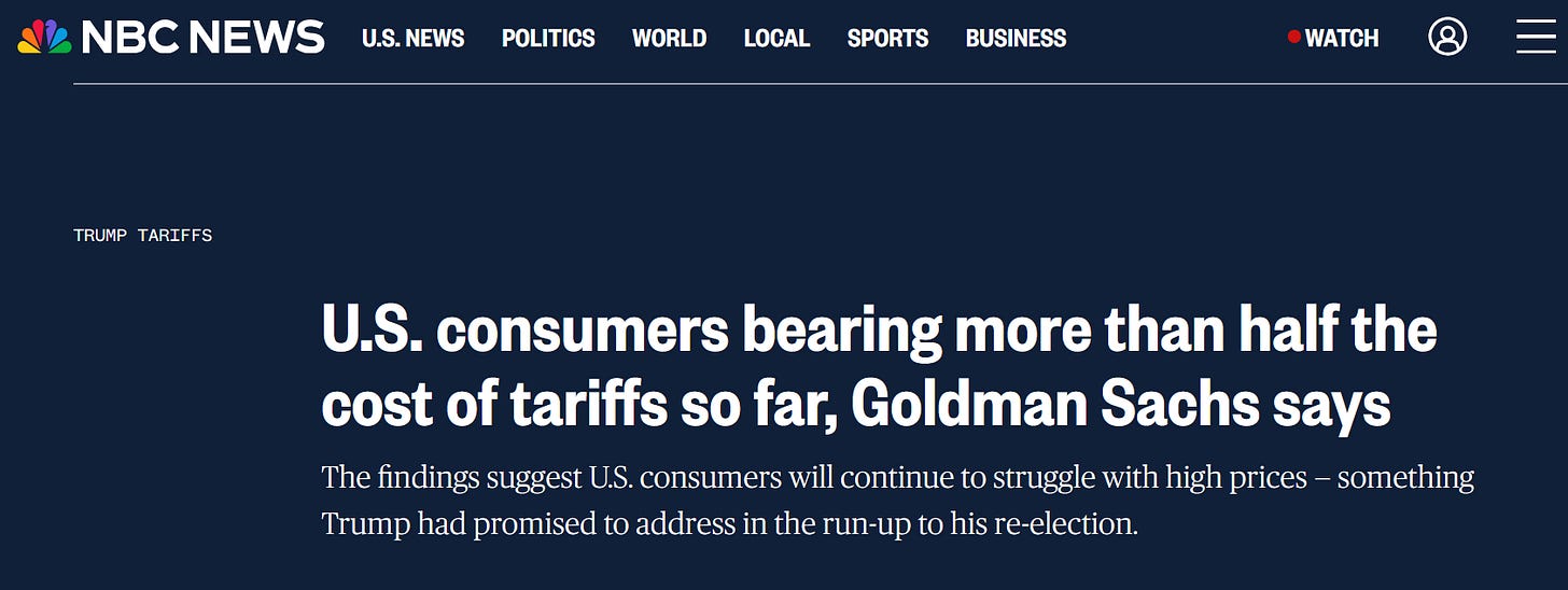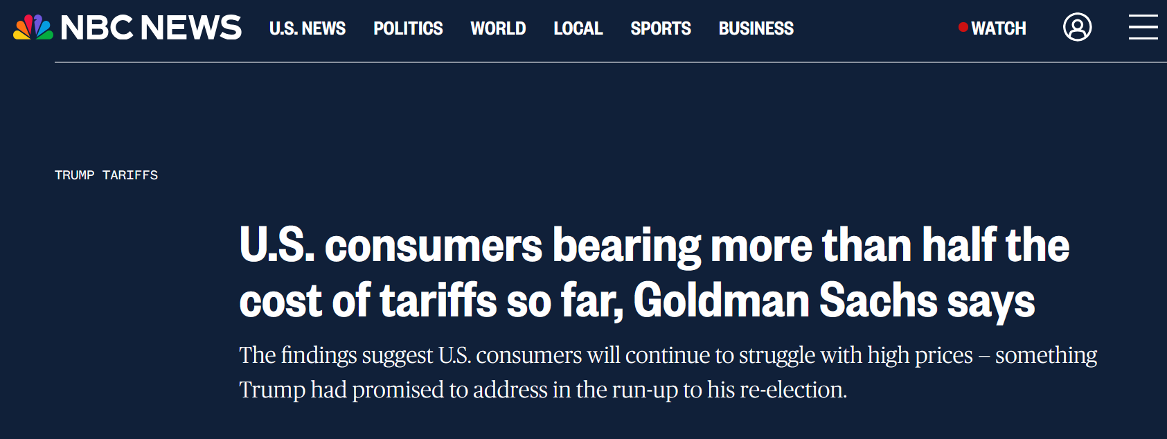 US consumers are paying for 55% of the cost of Trump’s tariffs, according to analysis by Goldman Sachs.