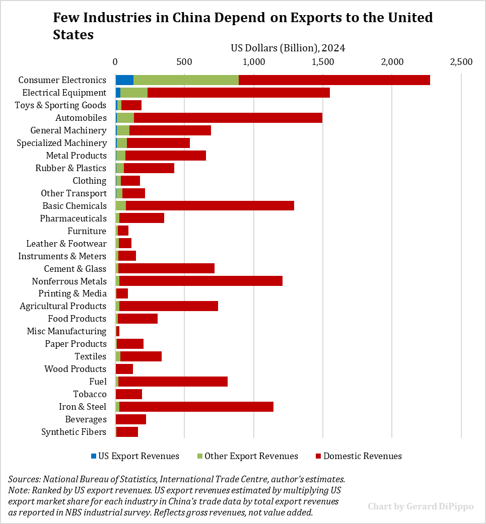 Yes, China does generate significant revenue through the export of consumer electronics, but even in that industry, the majority of revenue derives from domestic sales. For all other major Chinese industries, domestic revenues make up the vast majority of total revenue.
