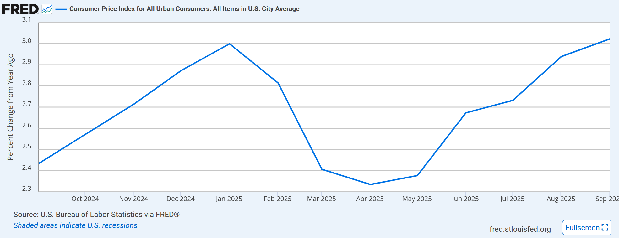 The consumer price index (CPI) was at 3% in September 2025. It has stuck persistently above the 2% inflation target that is set by the Federal Reserve, the US central bank.