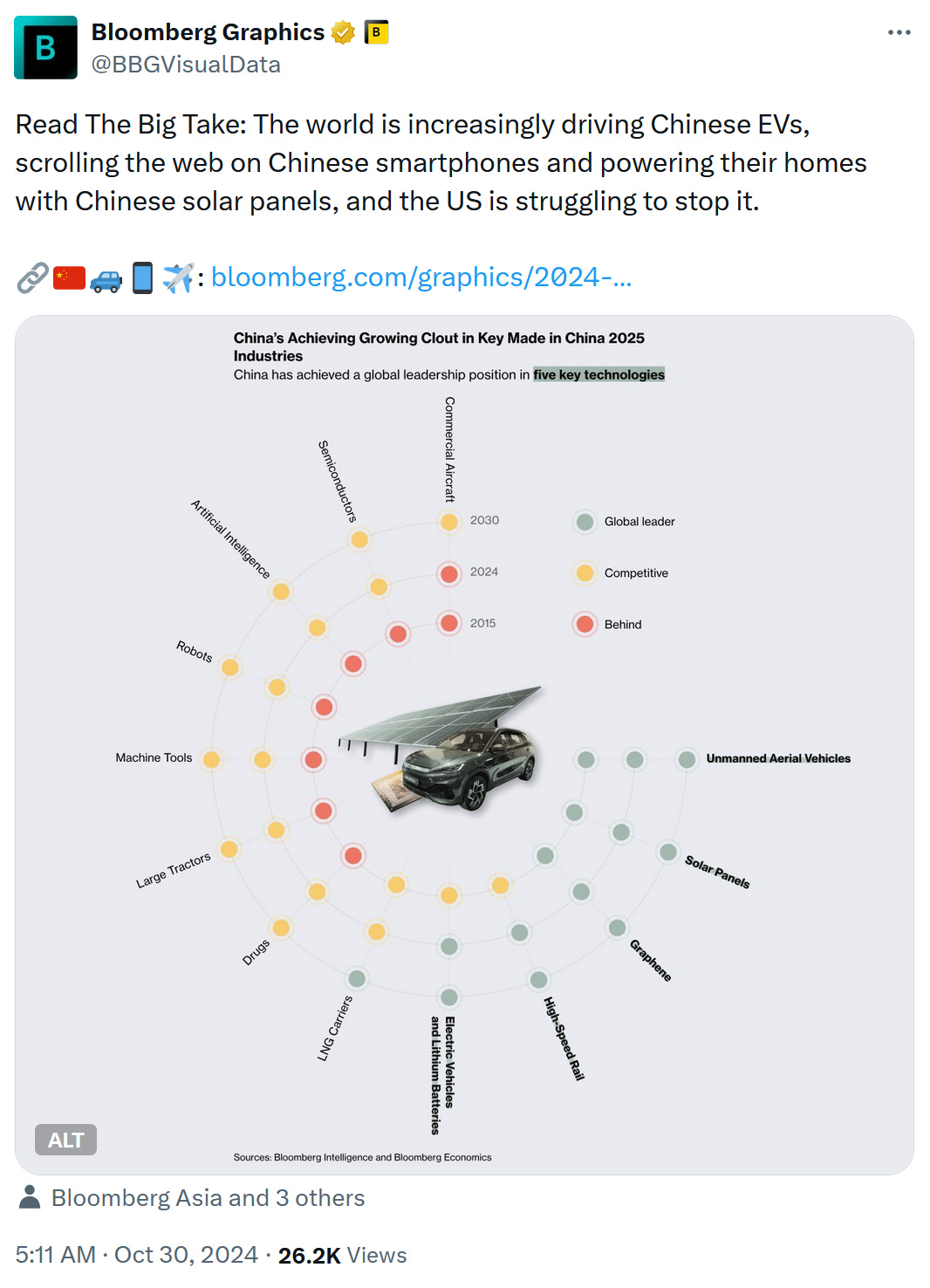 Bloomberg concluded that China was successful in almost all of the industries it targeted. It is already the global leader in five key technologies, and is rapidly catching up in seven more.