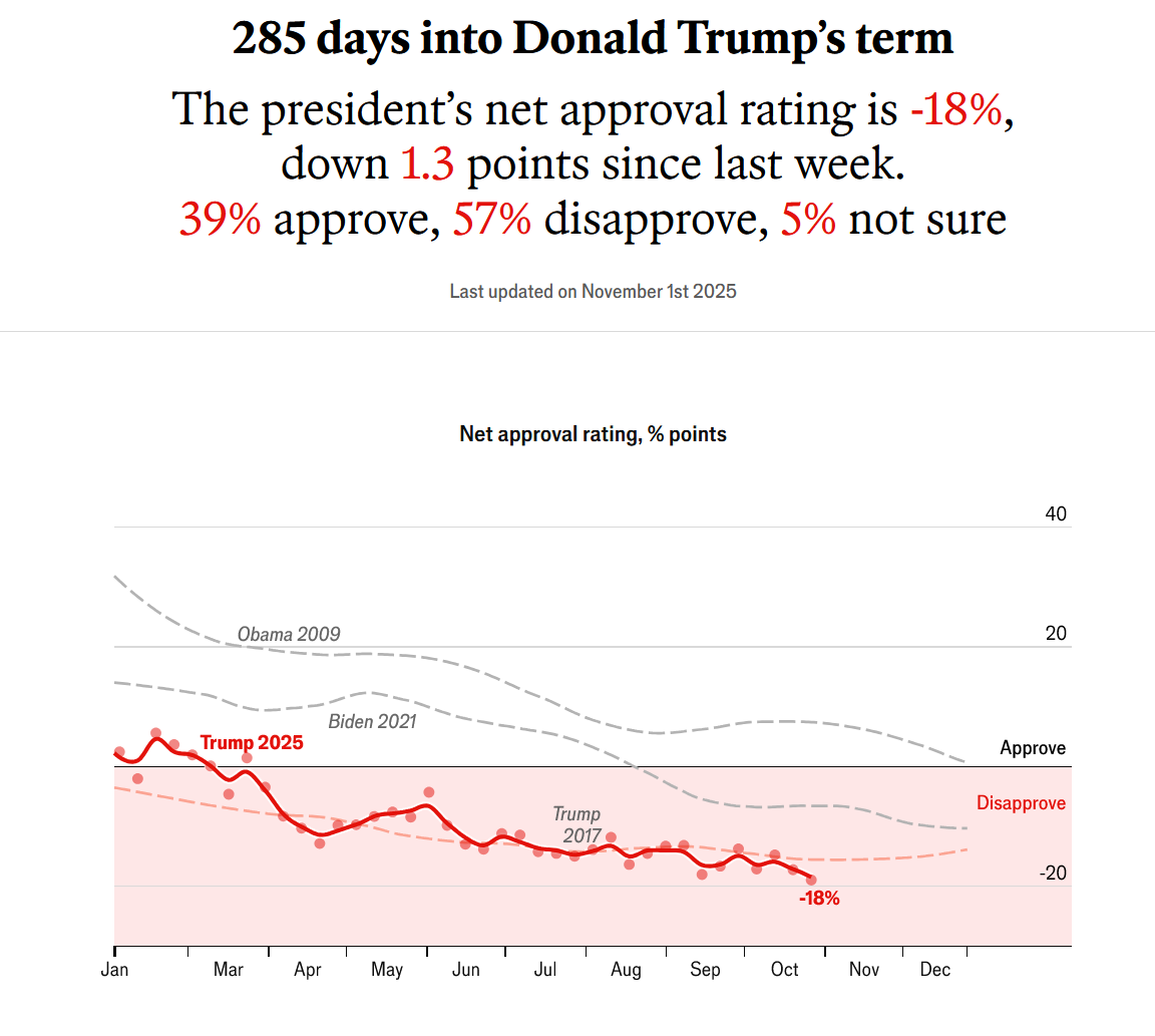 Trump had a net approval rating of -18% as of 1 November, which was 285 days into his second term as US president, according to polling from The Economist.