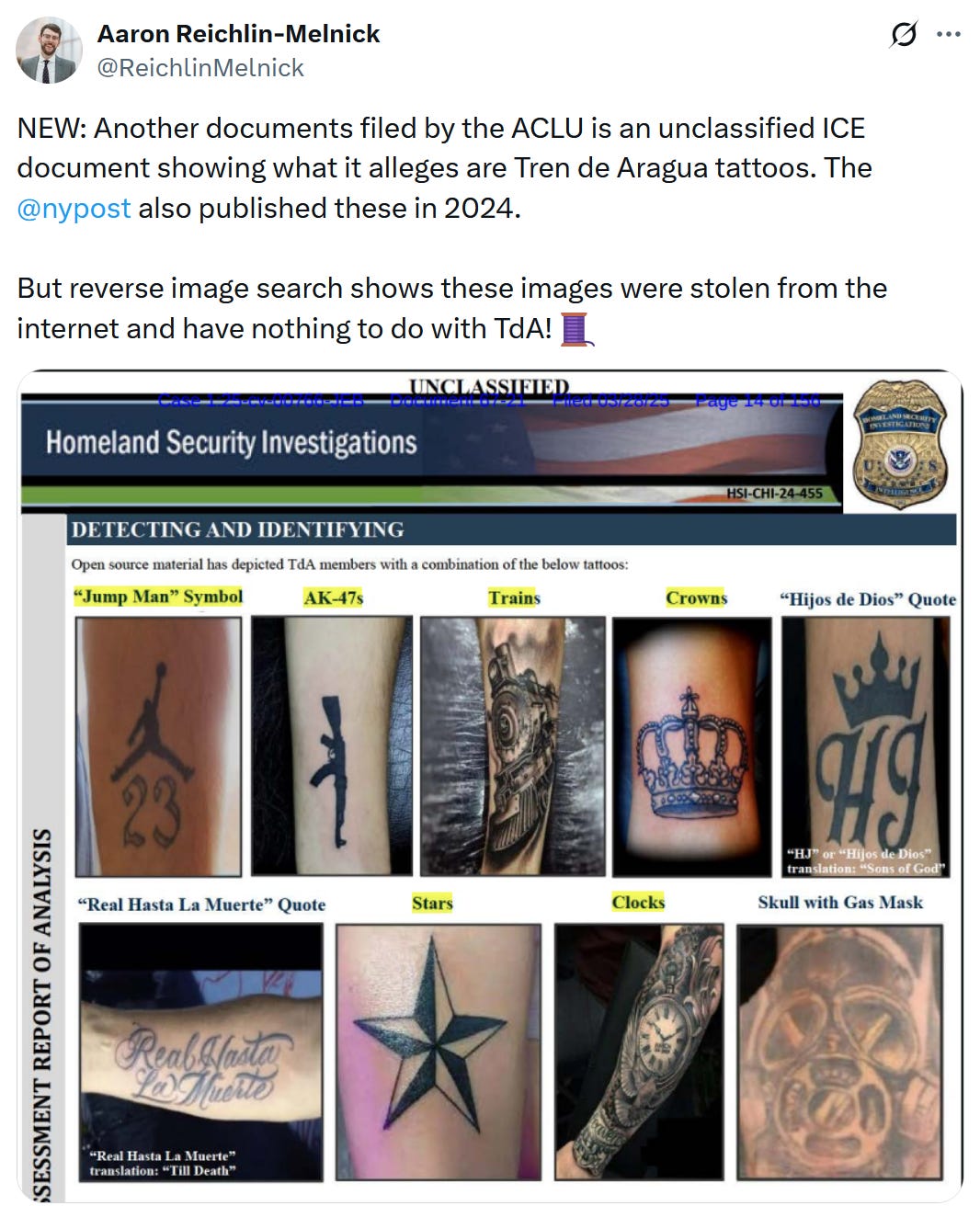 Moreover, ICE has arrested and deported immigrants simply for having tattoos. The American Civil Liberties Union (ACLU) got access to internal documents that show that ICE is using random photos from Google to absurdly claim that tattoos of a star, a crown, or Michael Jordan are “gang symbols”.