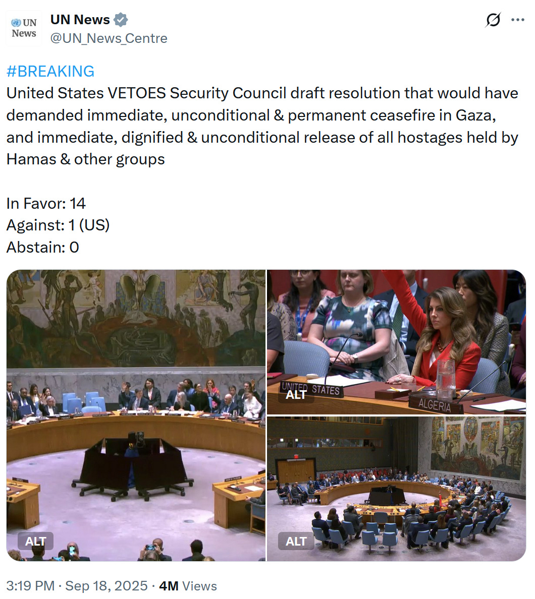 Between October 2023 and September 2025, the US government used its veto six times to unilaterally block resolutions that called for peace and a ceasefire in Gaza.