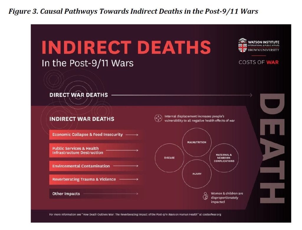 The document stressed how the "post-9/11 wars have caused widespread economic hardship for people in the war zones, and how poverty, in turn, has been accompanied by food insecurity and malnutrition, which have led to diseases and death, particularly amongst children under age five".