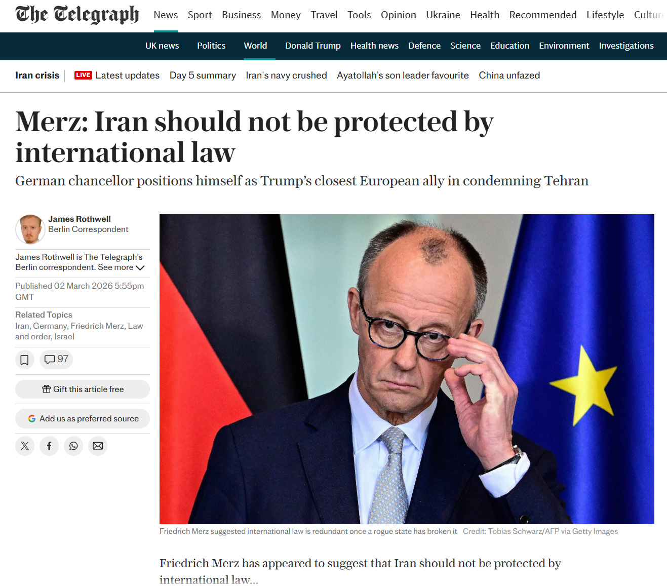 The German government has strongly supported the US-Israeli war on Iran. In fact, Merz argued that Iran should not be protected by international law.