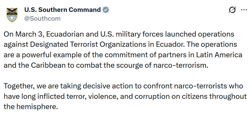 Southern Command announced that US military forces are fighting in Ecuador. It claimed they are combating “narco-terrorism”.