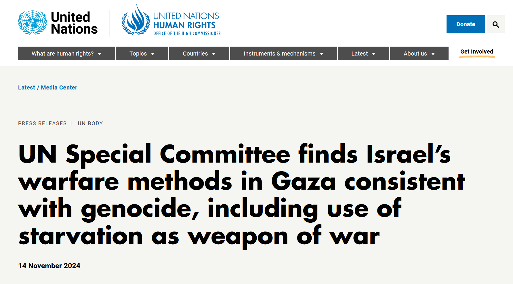 The United Nations convened a special committee to investigate Israel's warfare methods in Gaza, and it concluded in a November report that they are "consistent with the characteristics of genocide, with mass civilian casualties and life-threatening conditions intentionally imposed on Palestinians there".